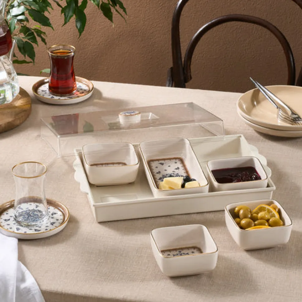 Genießen Sie Ihre Morgenstunden mit dem Karaca Elena 7-teiligen Keramik-Frühstücksset. Es wurde mit Blick auf Praktikabilität und Eleganz entworfen und enthält Schalen, eine Servierplatte sowie ein Tablett mit Deckel – ideal für den täglichen Gebrauch und ungezwungene Zusammenkünfte.