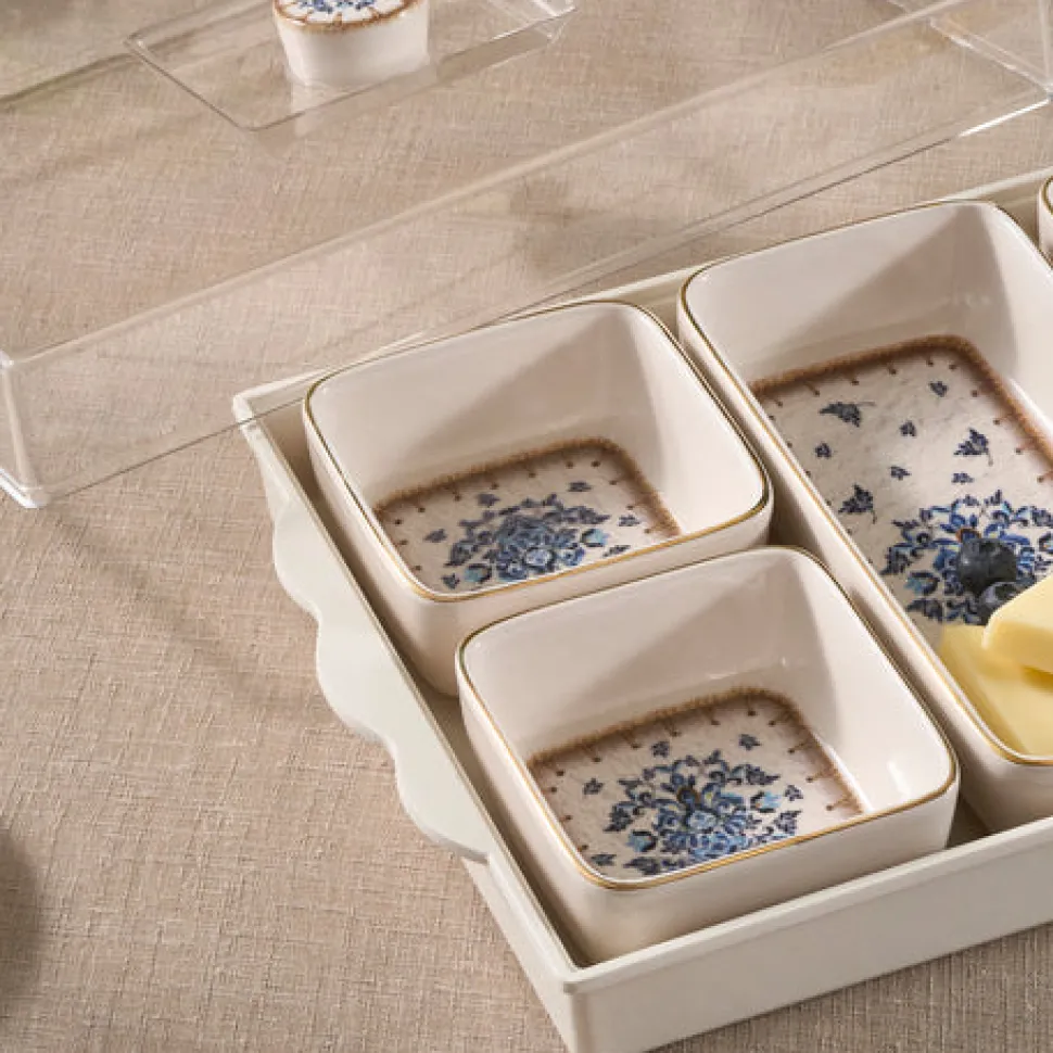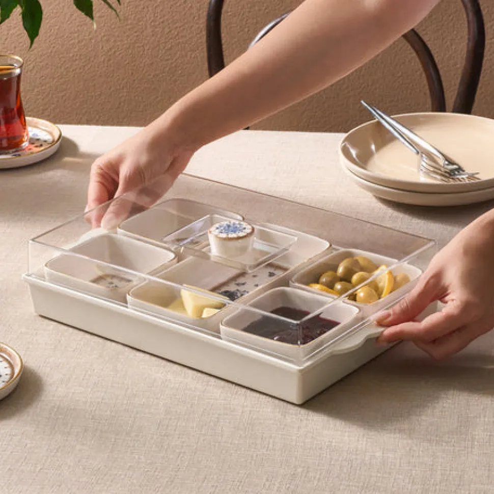 Gefertigt aus hochwertiger Keramik, vereint jedes Stück Langlebigkeit mit zeitloser Eleganz. Das Tablett mit passendem Deckel hält Speisen frisch und ordentlich präsentiert, während die Schalen und die Platte perfekt zum Servieren von Oliven, Käse, Marmeladen und mehr geeignet sind.
