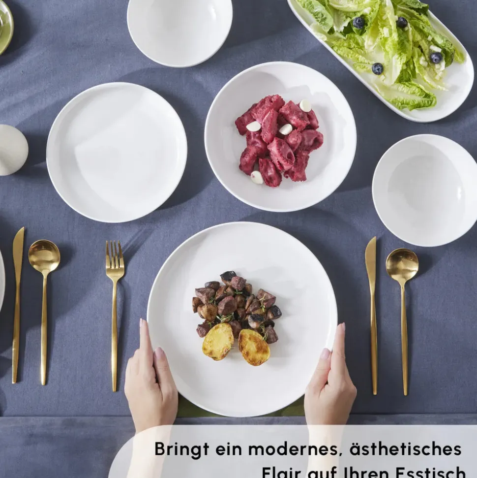 Das Karaca New Generation Bone Geschirrset hat ein elegantes Design und ist sicher für den täglichen Gebrauch. Das New Generation Bone Geschirr ist fein genug, um das Licht durchzulassen, und dennoch widerstandsfähiger gegen Stöße und Temperaturschwankungen als Porzellan. Es ist dünn und glatt.