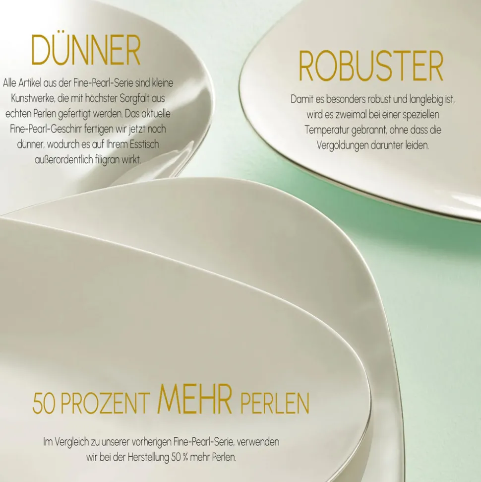 Die Fine Pearl Serie von Karaca ist weltweit das erste Tafelservice, das aus echten Perlen gefertigt wurde. Nun bietet Fine Pearl Extra mit 50 % mehr Perlenanteil noch mehr Glanz und Eleganz für Ihre Tafel.
