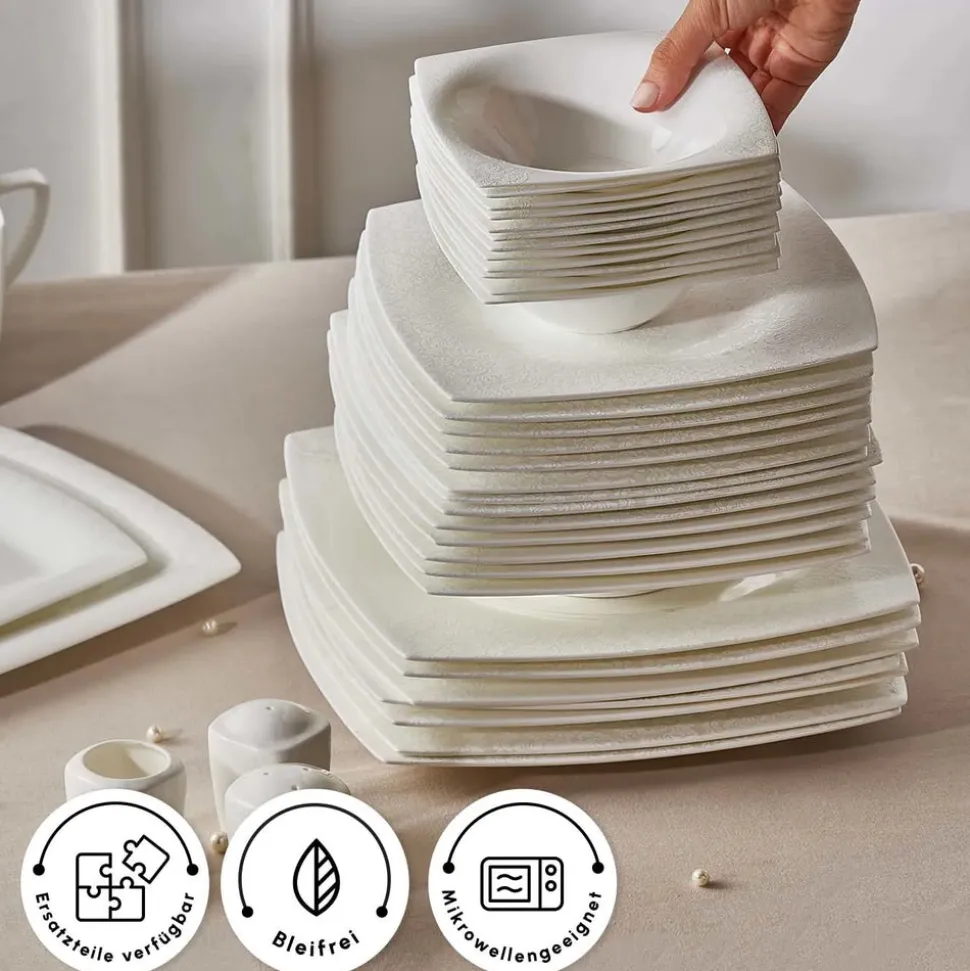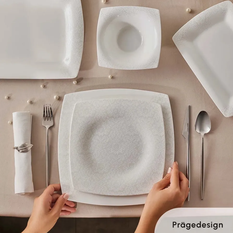 Karaca Fine Pearl Helen 58-teiliges Tafelservice für 12 Personen – Eckiges Perlendesign