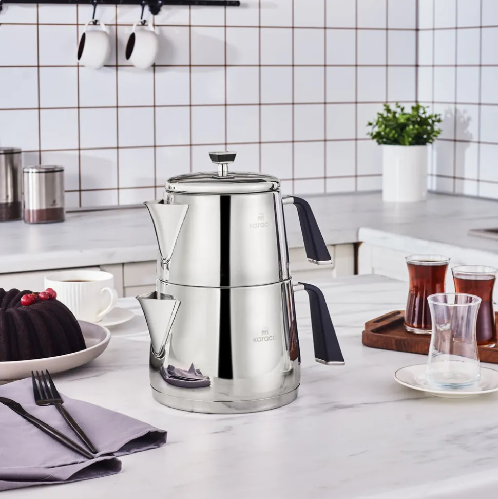 Dank seiner Struktur aus rostfreiem 18/10 Cr-Ni-Stahl ist das Karaca Steel Teapot Set sehr langlebig, gesund und brüht Ihren Tee köstlich auf. Es besteht aus einer 1-Liter-Teekanne und einem 2-Liter-Wasserkocher. Mit seinen brennfreien Griffen lässt sich der Tee leicht servieren. Die Kanne hat eine speziell polierte Oberfläche, damit der Glanz des ersten Tages erhalten bleibt. Er spart Zeit und Energie dank des Kapselbodens, der auf allen Herdarten, auch auf Induktionsherden, die höchste Wärmeübertragung gewährleistet.
