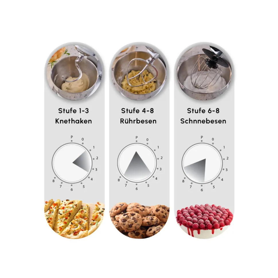 8 VERSCHIEDENE GESCHWINDIGKEITSEINSTELLUNGEN – PULSEinstellung, Programmabbruch, planetarische Rührbewegung