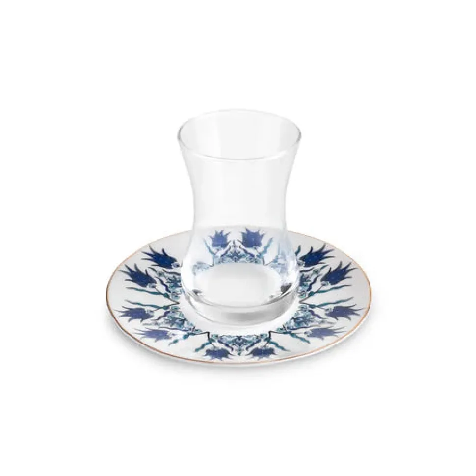 Das Set umfasst sechs transparente Teegläser mit 130 ml Fassungsvermögen sowie sechs Untertassen aus Bone China, verziert mit ausdrucksstarken blauen Motiven. Die Kombination aus Glas und hochwertigem Bone China sorgt für eine elegante Präsentation und langlebige Qualität.