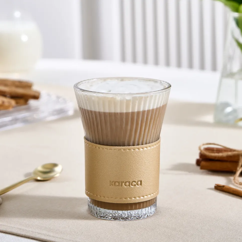 Schlürfen Sie Ihren Milchkaffee auf die stilvollste Art und Weise mit Ihrem Glasbecher mit Lederhülle und Karaca-Logo!