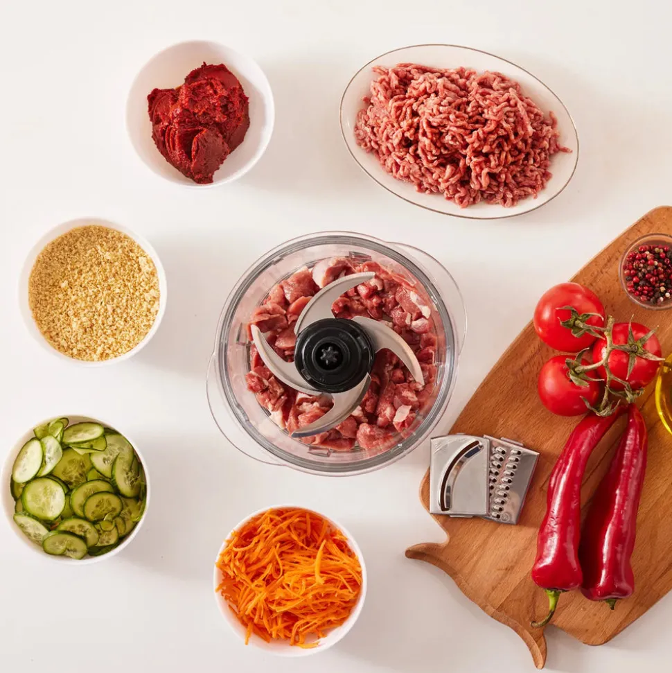 - Das 1,5-Liter-Fassungsvermögen des Glas-Hackbehälters mit seiner zweilagigen 4-Klingen-Struktur ermöglicht es Ihnen, Gemüse, Fleisch und Obst in den gewünschten Mengen mühelos auf einmal zu hacken.