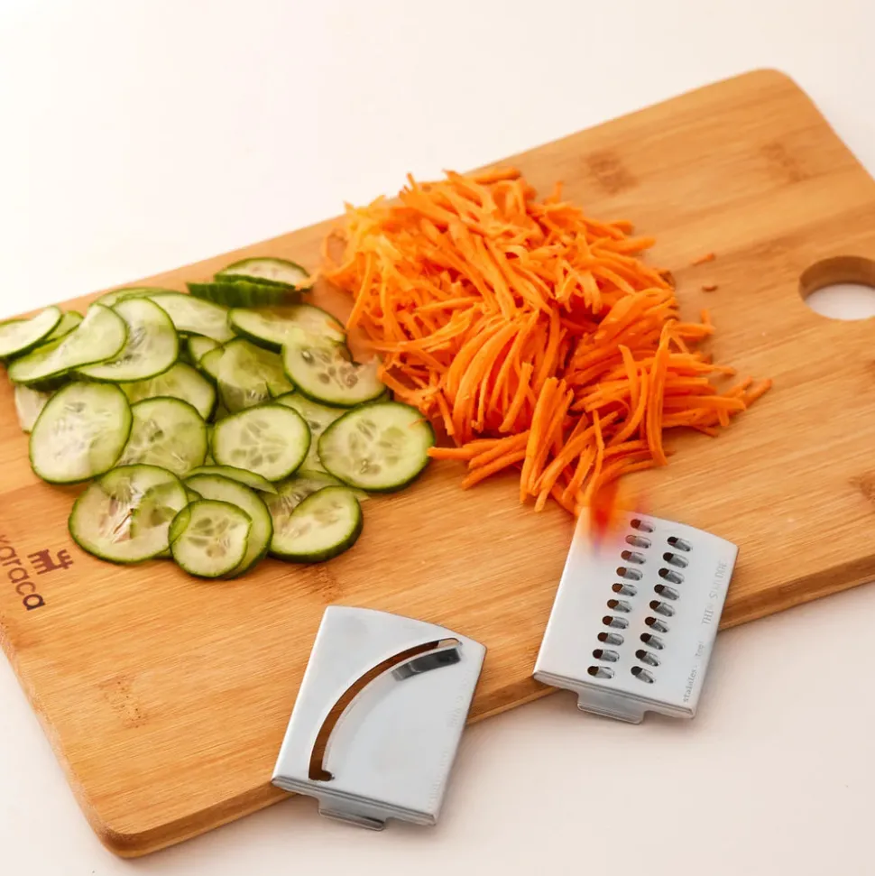 - Bereiten Sie bunte Salate zu, indem Sie Ihre Früchte und Gemüse nach Belieben schneiden oder reiben, dank der Edelstahlreibe- und -schneidzubehörteile.