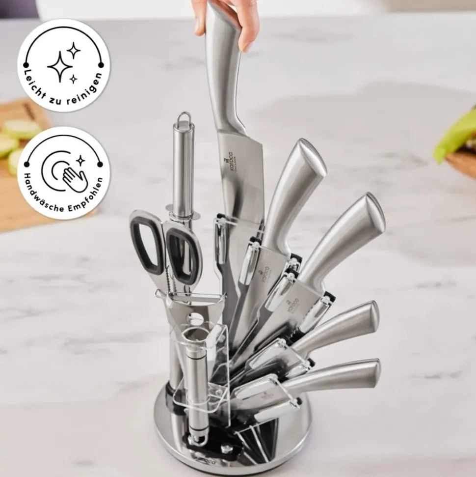 Das Karaca Meister Palm 9-teilige Stahl-Messerset ist aus hochwertigem deutschen Stahl gefertigt, um perfekte Leistungen bei allen Schneide- und Hackaufgaben in Ihrer Küche zu gewährleisten. Dank der überlegenen Materialqualität behält die Edelstahlstruktur des Karaca Meister Palm Messersets ihre Schärfe und ihren Glanz. Dieses umfassende Set umfasst 9 Teile: ein Schneidemesser, ein Hackmesser, ein Schälmesser, ein Kochmesser und ein Brotmesser sowie einen Schäler, einen Schärfer und eine Küchenschere, um all Ihre Bedürfnisse zu erfüllen. Der drehbare und öffnbare Edelstahl-Messerblock bietet eine einfache Handhabung und hilft Platz zu sparen.