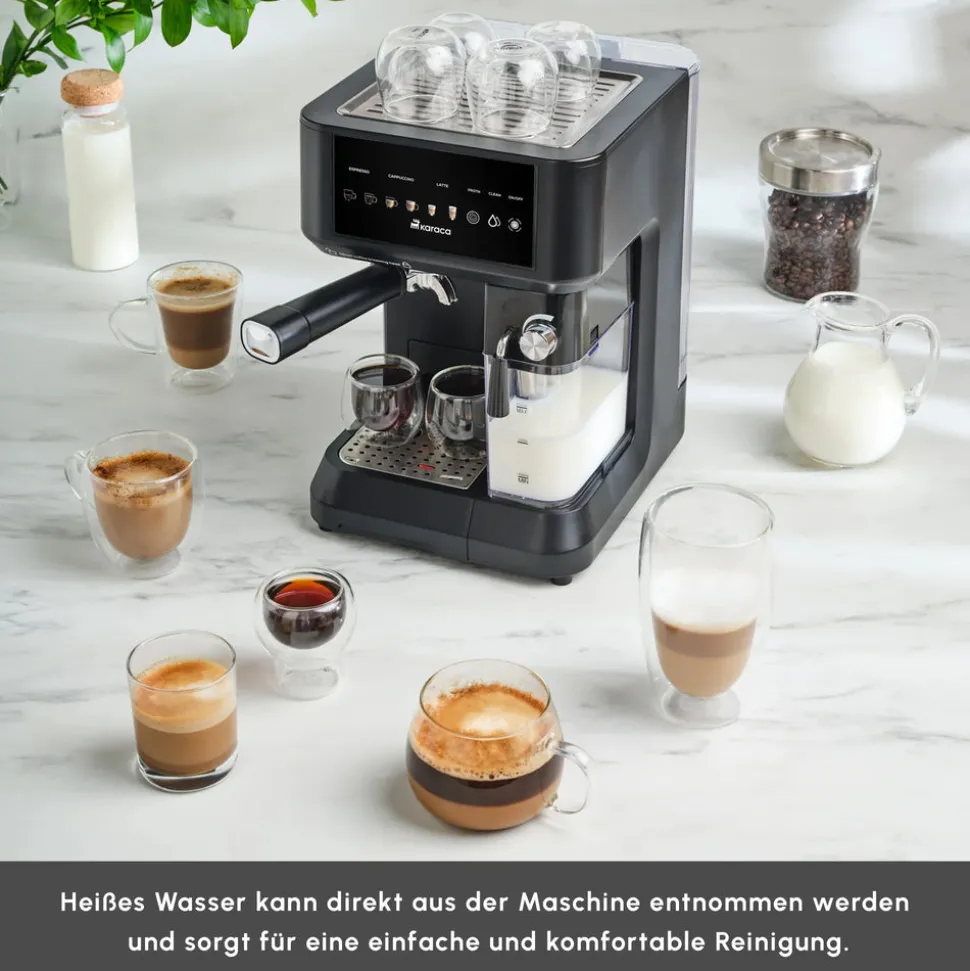 Mit der Karaca MyCaffe Barista S10 Automatischen Espressomaschine bereiten Sie Espresso, Latte, Cappuccino, Americano, Flat White, Cortado, Macchiato, Lungo, Affogato und viele weitere Kaffeespezialitäten in perfekter Qualität zu.
