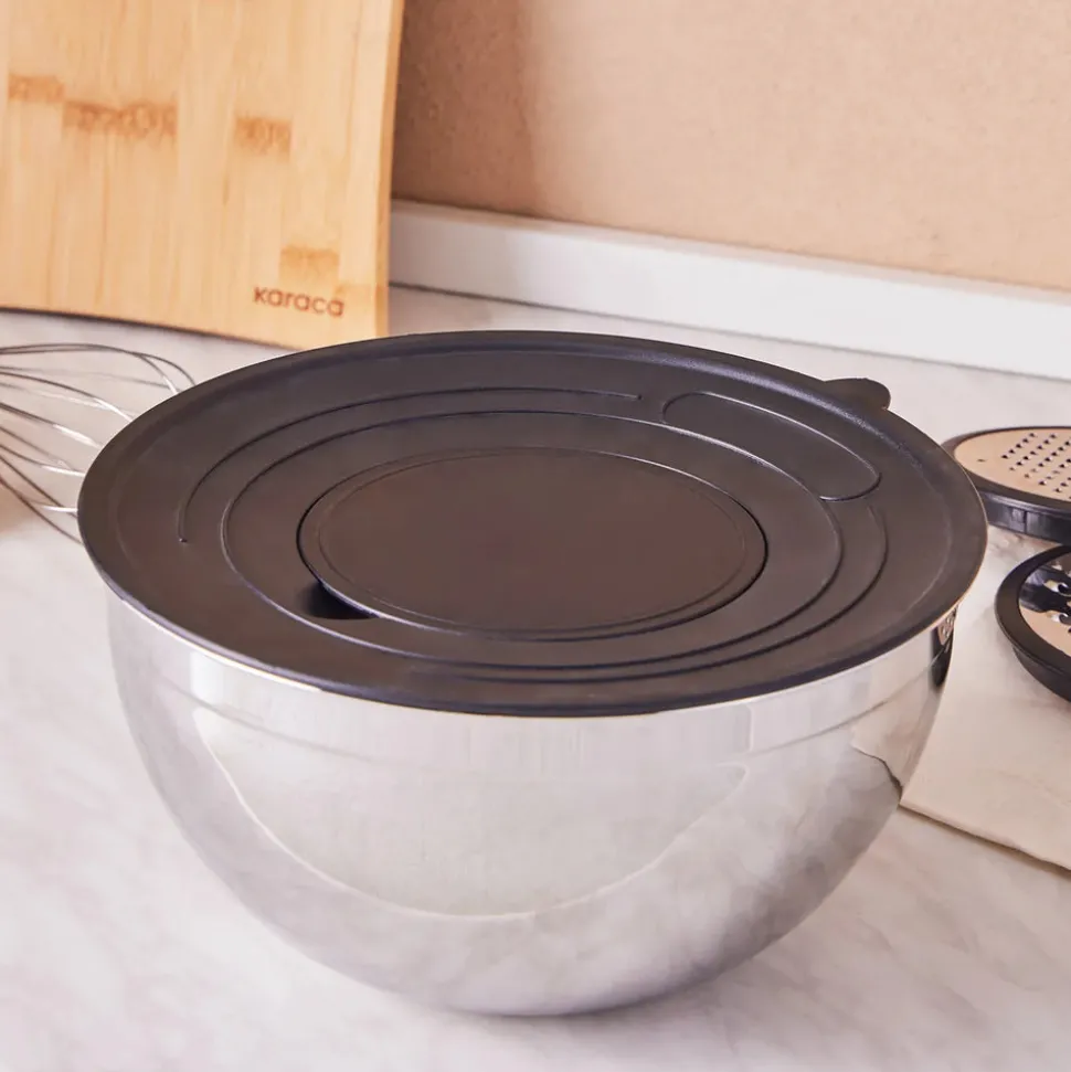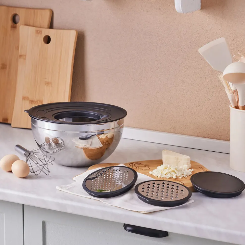 Groyya, ein vielseitiger Misch- und Aufbewahrungsbehälter aus Edelstahl, bietet 3 verschiedene Funktionen in einem Produkt: Reiben, Mischen und Aufbewahren.