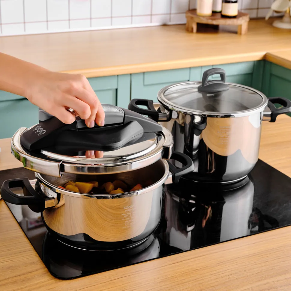 Dieses vierteilige Schnellkochtopfset punktet gleich in mehrfacher Hinsicht. Im Set enthalten ist sind folgende Töpfe aus rostfreiem Edelstahl: Ein großer Schnellkochtopf 6 Liter, sowie eine kleiner 4 Liter Schnellkochtopf. Sowohl der kleine als auch der große Schnellkochtopf eignen sich für Induktion oder ein herkömmliches Ceranfeld. Durch die optimale Hitzeverteilung können Gerichte aller Art zeitsparend zubereitet werden und benötigen hierzu deutlich weniger Energie. Seien es Suppen, Braten, Schmorgerichte oder Beilagen wie Kartoffeln: Die Dampfgarung verkürzt den Garvorgang auf ein Minimum und verringert den täglichen Aufwand für die Zubereitung von Mittag- und Abendessen erheblich