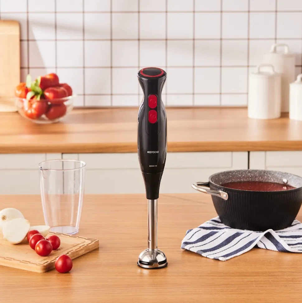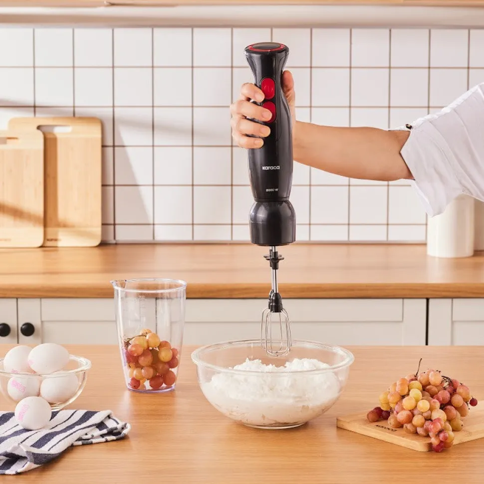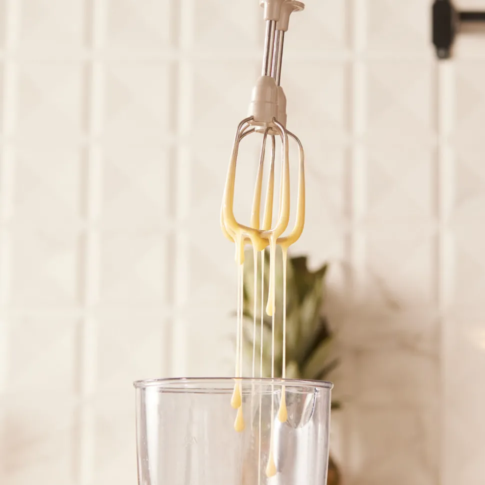 Dank der doppelten Stahlmixeraufsätze können Sie schnell Produkte wie Kuchenteig, Sahne, Babynahrung, Mayonnaise usw. zubereiten.