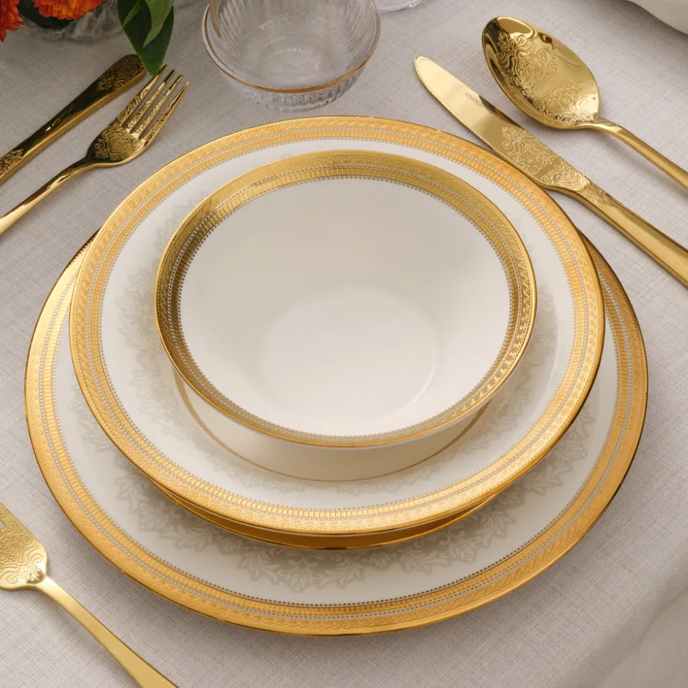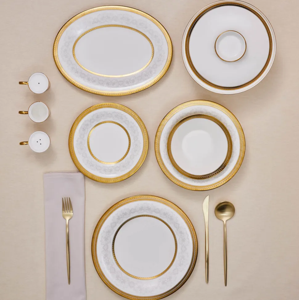 Die Karaca Royal Bone Collection definiert Eleganz und Luxus auf dem Esstisch neu – mit raffinierten Linien und exquisiter Handwerkskunst. Ihrem „Royal“-Namen gerecht, bietet diese exklusive Kollektion ein leichteres, transparenteres Design und zugleich außergewöhnliche Haltbarkeit. Mit fein gearbeiteten Rändern, eleganten Mustern und goldenen Akzenten schafft das Royal Bone Geschirr eine edle Atmosphäre für den Alltag und einen bleibenden Eindruck bei besonderen Anlässen.