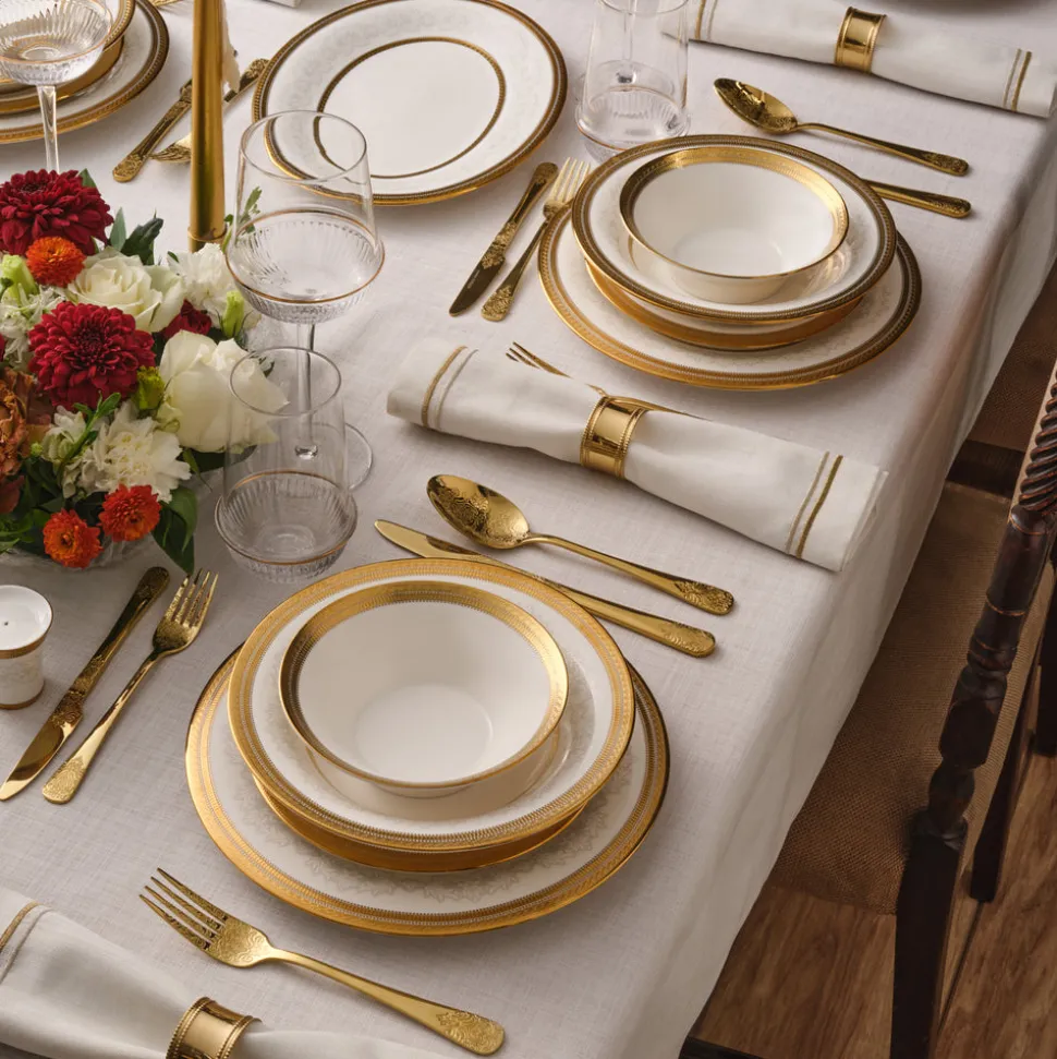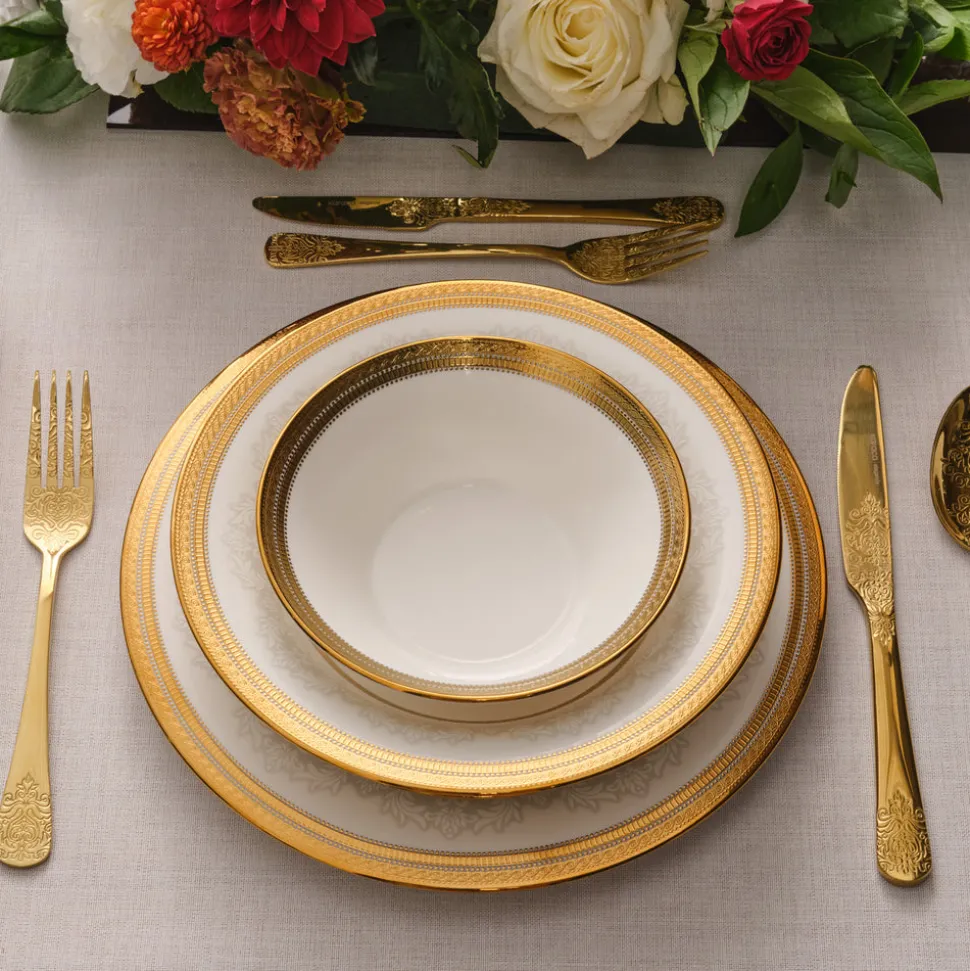 Karaca Royal Bone China Charlotte 55-teiliges Tafelservice für 12 Personen, Gold