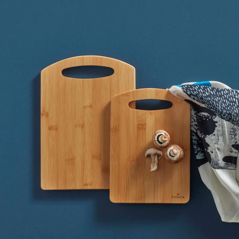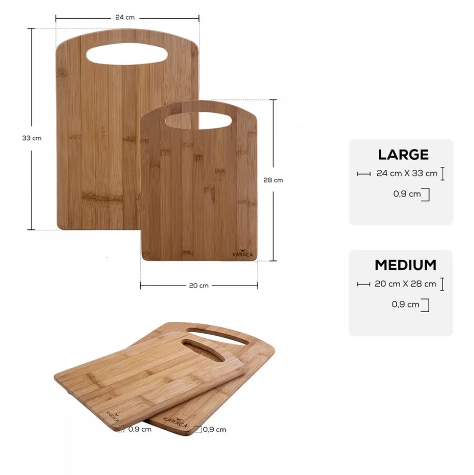 Karaca Stark 2-teiliges Schneidebrett wird in zwei Größen als M und L hergestellt. Die Maße des kleineren Schneidebretts sind 28x20x0,9 cm, während die Maße des größeren Bretts 33x24x0,9 cm betragen. Das messerfreundliche Bambus-Schneidebrett von Stark, das eine dünne, aber sehr hochwertige und solide Struktur hat, ist in Ihren Küchen die reinste Form der Natur! Um eine lange Lebensdauer zu gewährleisten, ist es nicht empfehlenswert, Bambusprodukte in der Spülmaschine zu reinigen. Legen Sie dieses Produkt, das eines der beliebtesten Doppelschneidebrettmodelle ist, jetzt in den Warenkorb, um es nicht zu verpassen!
