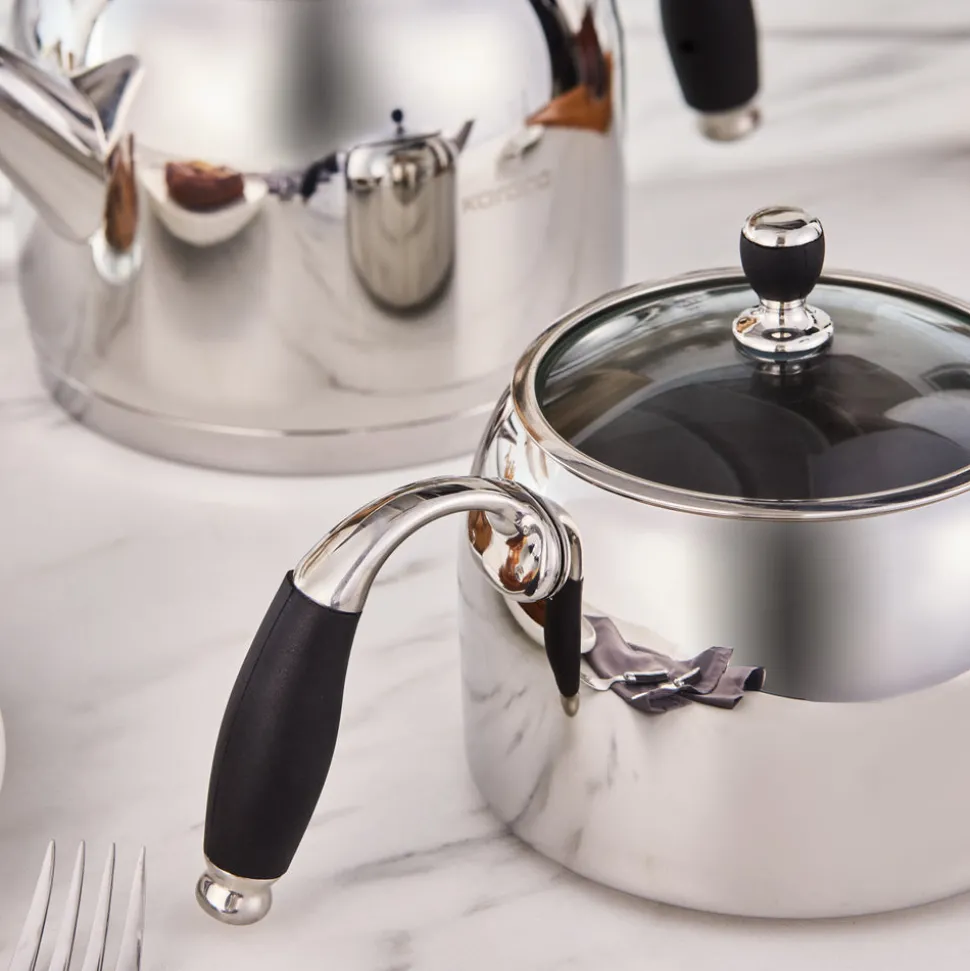 Dank seiner 18/10 Cr-Ni Edelstahlstruktur ist das Karaca Stahl-Teekessel-Set äußerst langlebig, bietet eine gesunde Nutzung und sorgt für köstlich gebrühten Tee. Es besteht aus einer 1-Liter-Teekanne und einem 2-Liter-Wasserkessel. Mit seinen hitzebeständigen Griffen ermöglicht es ein einfaches Einschenken.