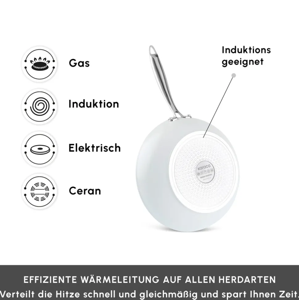 Ein brandneues Pfannenset mit hervorragenden Antihafteigenschaften: SwissCrystal Das Karaca SwissCrystal Pfannenset, das seine Stärke aus der antihaftbeschichteten SwissCrystal Oberfläche bezieht, bietet Ihnen die Möglichkeit, eine Reihe von Gerichten auf praktische Weise zuzubereiten, wie z.B. Eier, Fisch, Hähnchen, und das ganz ohne Öl. Die antihaftbeschichtete Oberfläche wird mit Schweizer Kristallen hergestellt und enthält keine gesundheitsgefährdenden chemischen Verbindungen wie „PFAS“, die die Gesundheit beeinträchtigen. Zudem ist das SwissCrystal Pfannenset leicht zu reinigen! Egal, welches Gericht Sie zubereitet haben, es genügt, es kurz unter Wasser zu halten. Die essentiellen und praktischen Eigenschaften des SwissCrystal Pfannensets erleichtern Ihnen die Zubereitung schmackhafter Gerichte und sorgen für eine einfache Handhabung in Ihrer Küche.