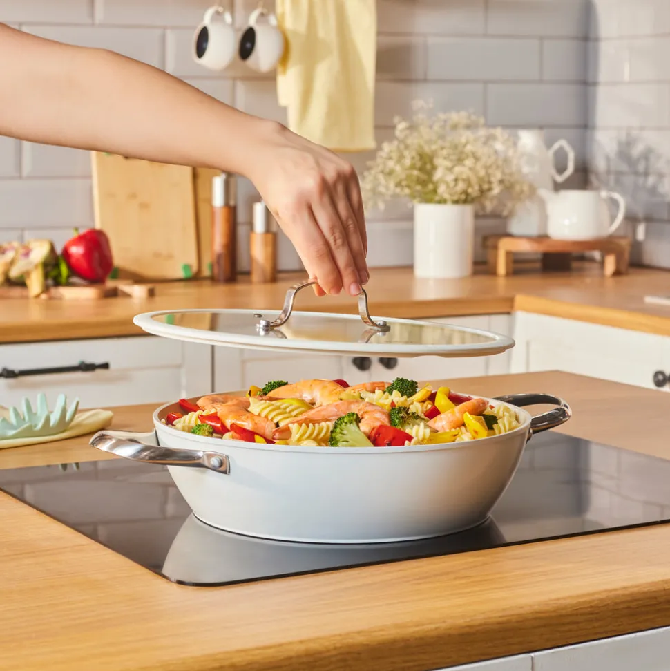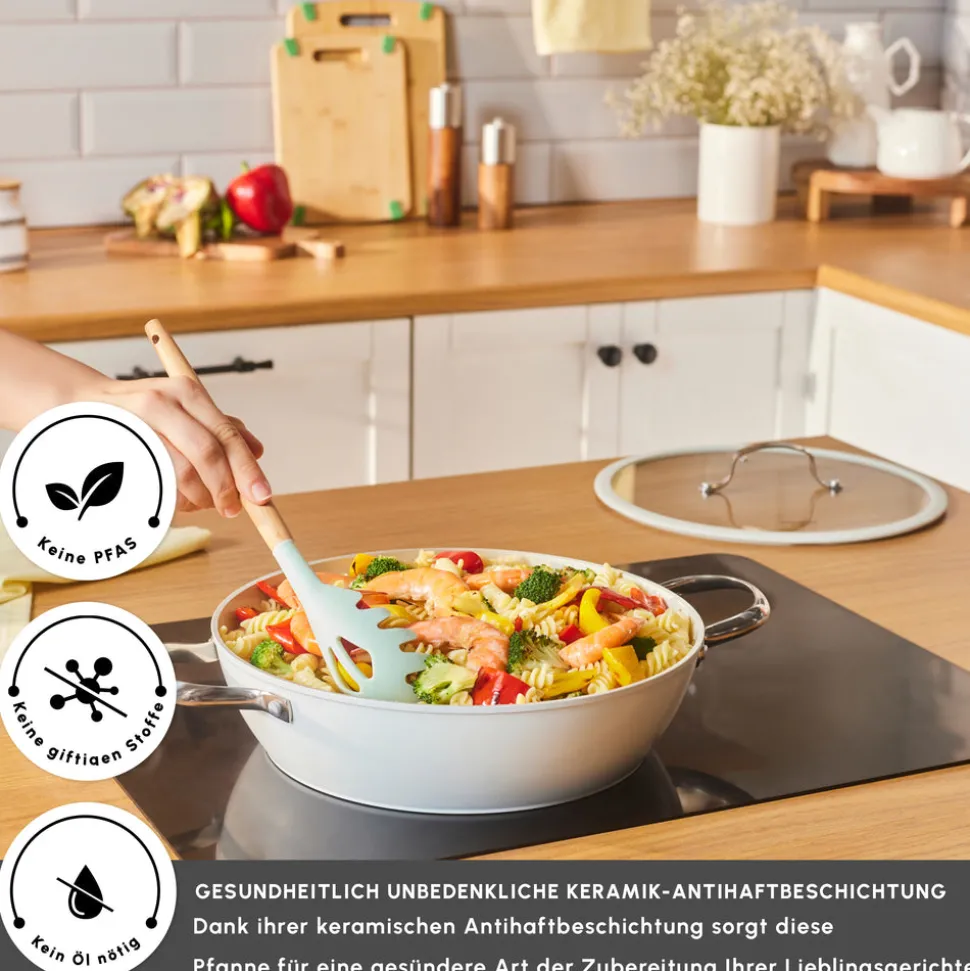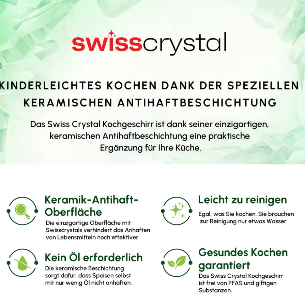 Ein brandneues Pfannenset mit hervorragenden Antihafteigenschaften: SwissCrystal Das Karaca SwissCrystal Pfannenset, das seine Stärke aus der antihaftbeschichteten SwissCrystal Oberfläche bezieht, bietet Ihnen die Möglichkeit, eine Reihe von Gerichten auf praktische Weise zuzubereiten, wie z.B. Eier, Fisch, Hähnchen, und das ganz ohne Öl. Die antihaftbeschichtete Oberfläche wird mit Schweizer Kristallen hergestellt und enthält keine gesundheitsgefährdenden chemischen Verbindungen wie „PFAS“, die die Gesundheit beeinträchtigen. Zudem ist das SwissCrystal Pfannenset leicht zu reinigen! Egal, welches Gericht Sie zubereitet haben, es genügt, es kurz unter Wasser zu halten. Die essentiellen und praktischen Eigenschaften des SwissCrystal Pfannensets erleichtern Ihnen die Zubereitung schmackhafter Gerichte und sorgen für eine einfache Handhabung in Ihrer Küche.