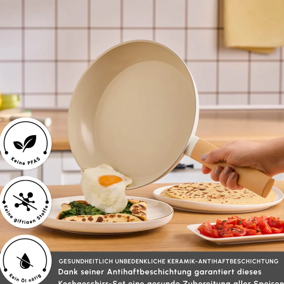 Mit der Stärke der Antihaft-Oberfläche SwissCrystal bietet das Karaca SwissCrystal Pfannenset die Möglichkeit, eine Vielzahl von Gerichten auf praktische Weise zuzubereiten, einschließlich Eiern, Fisch und Hähnchen, und das ganz ohne Öl. Die Antihaft-Oberfläche wird mit Swiss-Kristallen hergestellt und enthält keine gefährlichen chemischen Verbindungen wie „PFAS“, die gesundheitsschädlich sind.