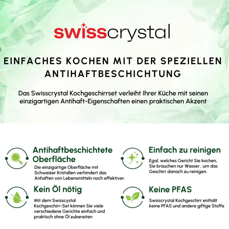 Die Antihaft-Oberfläche aus Swiss-Kristallen enthält keine schädlichen Chemikalien wie „PFAS“, die die menschliche Gesundheit gefährden können.