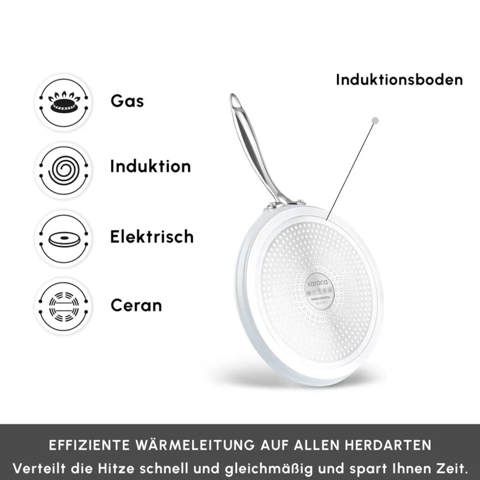 Ein brandneues Pfannenset mit hervorragenden Antihafteigenschaften: SwissCrystal Das Karaca SwissCrystal Pfannenset, das seine Stärke aus der antihaftbeschichteten SwissCrystal Oberfläche bezieht, bietet Ihnen die Möglichkeit, eine Reihe von Gerichten auf praktische Art und Weise zuzubereiten, wie z.B. Eier, Fisch, Hühnchen, und das ganz ohne Öl. Die antihaftbeschichtete Oberfläche wird mit Schweizer Kristallen hergestellt und enthält keine gesundheitsgefährdenden chemischen Verbindungen wie „PFAS“, die die Gesundheit beeinträchtigen. Zudem ist das SwissCrystal Pfannenset leicht zu reinigen! Egal, welches Gericht Sie zubereitet haben, es genügt, es kurz unter Wasser zu halten. Die essentiellen und praktischen Eigenschaften des SwissCrystal Pfannensets